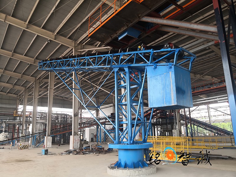 旋轉式皮帶輸送機,為散碎物料倉貯輸送設備,是在安裝有行走輪的支架上部的底盤上安裝一轉盤,轉盤可相對底盤作旋轉運動,皮帶輸送機的進料端座在轉盤頂部的托盤上,出料端為懸臂式,配重箱在托盤上用以上與懸臂配重,倉貯時,物料通過料斗由輸送帶送至遠端,推動懸臂即可改變堆積位置,在庫房內實現多點堆積而勿需停機和移動機體,連續作業省時省力,操作方便,尤其適用于糧食的倉貯輸送。